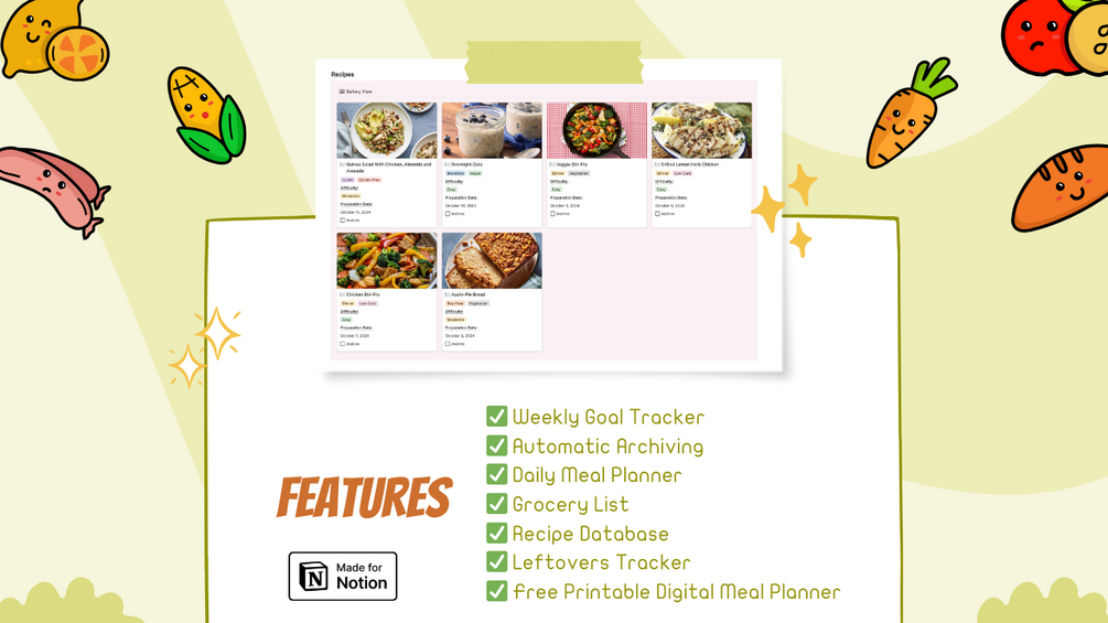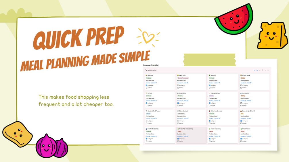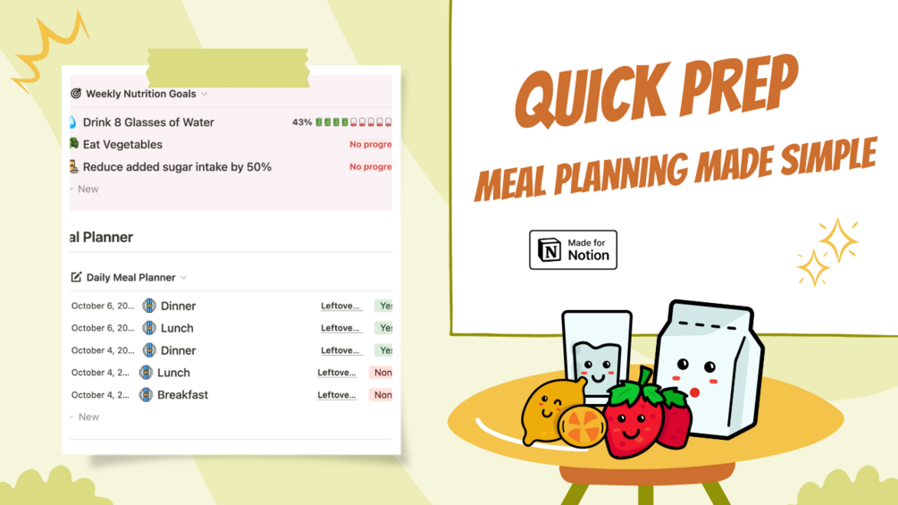 Achieve your health and wellness goals with this Quick Prep: Meal Planning Made Simple Notion Template! Designed for anyone looking to simplify nutrition tracking and meal planning, this template offers a streamlined, all-in-one setup to help you track weekly goals, organize meal prep, and manage grocery lists efficiently. As a bonus, a free digital meal planner is included, which can also be printed if you like to keep a hard copy!